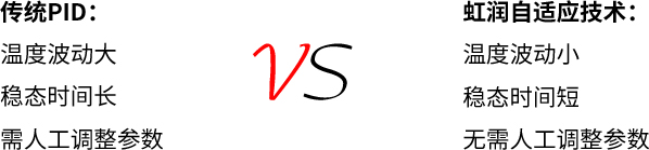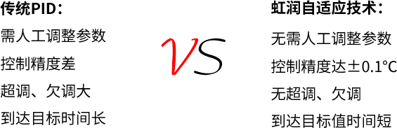 虹潤自適應(yīng)控制技術(shù)可自動整定出較佳PID值。監(jiān)視裝備的溫度控制狀態(tài),自動調(diào)節(jié)PID值,對工件變化及裝備變化、環(huán)境變化等進(jìn)行較佳溫度控制。