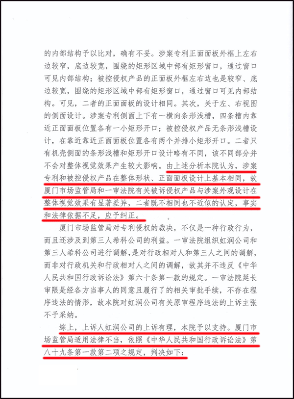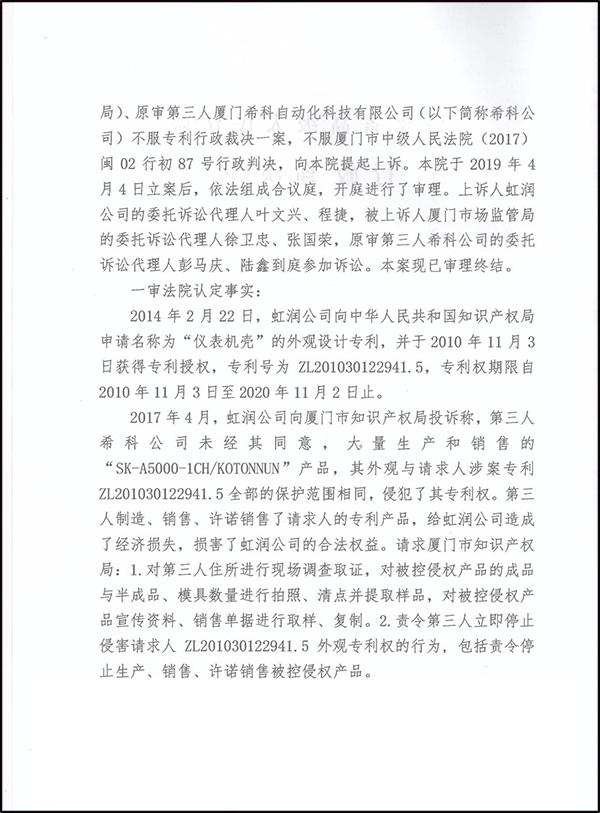 2015年9月福建順昌虹潤(rùn)精密儀器有限公司(以下簡(jiǎn)稱(chēng)虹潤(rùn)公司)在市場(chǎng)上發(fā)現(xiàn)廈門(mén)??谱詣?dòng)化科技有限公司(以下簡(jiǎn)稱(chēng)??乒荆┪唇?jīng)虹潤(rùn)公司同意,大量生產(chǎn)和銷(xiāo)售仿冒虹潤(rùn)NHR-8000系列無(wú)紙記錄儀的侵權(quán)產(chǎn)品??艫5000、A6000無(wú)紙記錄儀。侵犯了虹潤(rùn)公司的知識(shí)產(chǎn)權(quán)。虹潤(rùn)公司于2016年先發(fā)函告知??乒局兄骨謾?quán)行為,但??乒静挥枥頃?huì)。為了維護(hù)自身的合法權(quán)益,虹潤(rùn)公司又向廈門(mén)市市場(chǎng)監(jiān)督管理局(原廈門(mén)市知識(shí)產(chǎn)權(quán)局)申請(qǐng)行政處理,后再提起行政訴訟。2019年7月30日,福建省高級(jí)人民法院作出【2019】閩行終302號(hào)行政判決書(shū),認(rèn)定??乒旧a(chǎn)的產(chǎn)品與我司的“儀表機(jī)殼”外觀設(shè)計(jì)專(zhuān)利整體形狀、正面面板設(shè)計(jì)上基本相同。至此,虹潤(rùn)公司歷時(shí)四年的維權(quán)行為得到了法律支持,福建省高院終審認(rèn)定廈門(mén)??茻o(wú)紙記錄儀專(zhuān)利侵權(quán)。