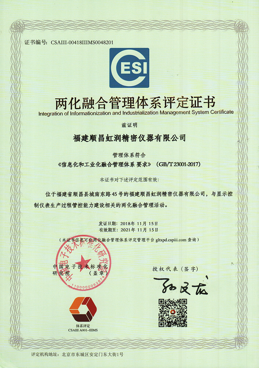 近年來(lái),虹潤(rùn)公司積極響應(yīng)國(guó)家號(hào)召,堅(jiān)持走“專(zhuān)業(yè)化、精細(xì)化、特色化、新穎化”的專(zhuān)精特新發(fā)展道路,邁出了可喜的步伐。公司是國(guó)家高新技術(shù)企業(yè)、國(guó)家級(jí)知識(shí)產(chǎn)權(quán)優(yōu)勢(shì)企業(yè)、福建省戰(zhàn)略性新興產(chǎn)業(yè)骨干企業(yè)、福建省科技小巨人領(lǐng)軍企業(yè),和上海理工大學(xué)莊松林院士合作建立了院士專(zhuān)家工作站,擁有500多項(xiàng)國(guó)家專(zhuān)利及100多項(xiàng)軟件著作權(quán)。主持或參與制定了56項(xiàng)國(guó)家標(biāo)準(zhǔn),嚴(yán)格按照ISO9001標(biāo)準(zhǔn)建立了質(zhì)量管理體系,“虹潤(rùn)”商標(biāo)被國(guó)家工商局認(rèn)定為“中國(guó)馳名商標(biāo)”。獲得工信部?jī)苫诤瞎芾眢w系認(rèn)證、歐盟CE認(rèn)證,國(guó)際SIL功能安全認(rèn)證,國(guó)家防爆證。公司先后研發(fā)出了數(shù)顯表與溫控器、無(wú)紙記錄儀、隔離器與安全柵、溫度變送器、壓力變送器、電量表與變送器、電能質(zhì)量分析儀、過(guò)程校驗(yàn)儀、可編程控制器、環(huán)境監(jiān)測(cè)儀表等十大系列高新技術(shù)產(chǎn)品,為用戶提供了技術(shù)含量高、品質(zhì)一流的優(yōu)質(zhì)產(chǎn)品和服務(wù),受到了用戶的廣泛贊譽(yù)。