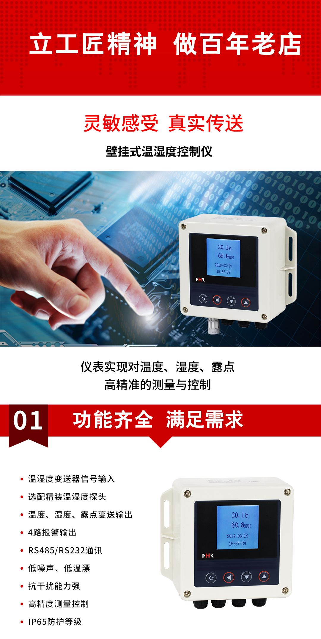 虹潤公司是專業(yè)生產(chǎn)環(huán)境監(jiān)測儀表的國家專精特新“小巨人”企業(yè)。生產(chǎn)的壁掛式溫濕度控制器,具有溫度、濕度、露點(diǎn)高精準(zhǔn)的測量,多種輸出類型,穩(wěn)定性強(qiáng),RS485/RS232通訊,IP65防護(hù)等級等特點(diǎn)。產(chǎn)品獲得一種手持式低功耗溫濕度檢測儀、大屏幕溫濕度記錄儀等2項國家發(fā)明專利,主持起草物聯(lián)網(wǎng)智能溫度儀表通用技術(shù)條件、冷鏈溫度記錄儀等2項國家標(biāo)準(zhǔn),通信系統(tǒng)多通道數(shù)據(jù)采集控制終端規(guī)范軍用標(biāo)準(zhǔn),以及現(xiàn)場設(shè)備集成等5項智能制造國家標(biāo)準(zhǔn),參與國際5G標(biāo)準(zhǔn)制定,取得溫濕度儀表等2項相關(guān)軟件著作權(quán)。產(chǎn)品廣泛應(yīng)用于工業(yè)現(xiàn)場、農(nóng)業(yè)大棚、倉儲物流、地下管廊、養(yǎng)殖孵化、配電機(jī)房等諸多領(lǐng)域。