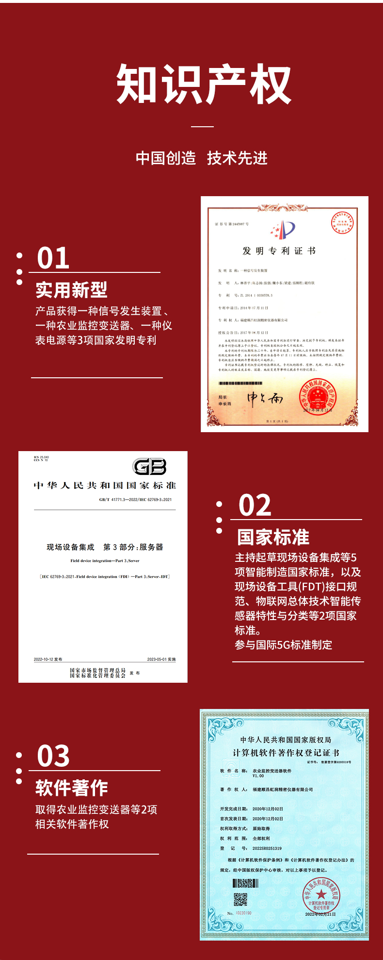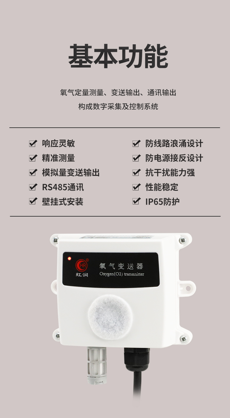 虹潤公司是專業(yè)生產(chǎn)環(huán)境監(jiān)測儀表的國家專精特新“小巨人”企業(yè)。生產(chǎn)的氧氣變送器,具有采用電化學原理,響應靈敏,準確度高,低功耗,模擬量變送輸出或RS485通訊等特點。產(chǎn)品獲得一種農(nóng)業(yè)監(jiān)控變送器、一種儀表電源等2項實用新型專利,主持起草現(xiàn)場設備集成等5項智能制造國家標準,以及現(xiàn)場設備工具(FDT)接口規(guī)范、物聯(lián)網(wǎng)總體技術(shù)智能傳感器特性與分類等2項國家標準,參與國際5G標準制定,取得農(nóng)業(yè)監(jiān)控變送器等3項相關(guān)軟件著作權(quán)。產(chǎn)品廣泛應用于機房、配電站、地下車庫、工廠倉庫、食品儲存、養(yǎng)殖場、果蔬林園等環(huán)境場合對氧氣濃度的檢測。