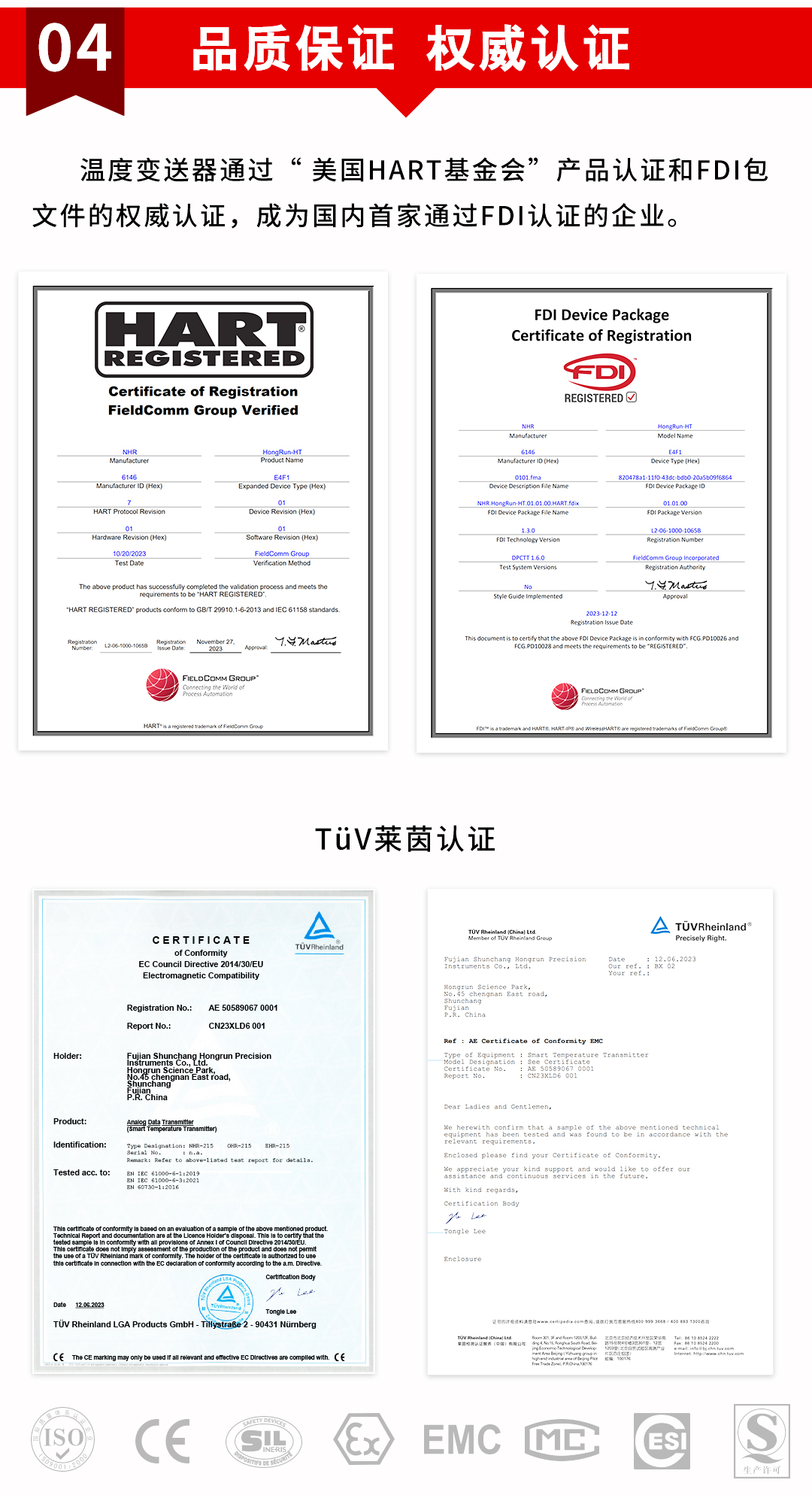 虹潤公司是專業(yè)生產(chǎn)溫度變送器的國家專精特新“小巨人”企業(yè)。生產(chǎn)的智能溫度變送器,具有適配各類溫度傳感器,精度高,通過編程線修改輸入信號類型及量程,高抗干擾,HART或485通訊等特點。該產(chǎn)品不僅通過HART基金會認證、德國萊茵 CE 認證與 SIL 功能安全認證,還獲得具備減震抗干擾能力的溫度變送器、信號隔離器、一種二端子模塊、無源信號隔離器等4項國家發(fā)明專利,主持起草物聯(lián)網(wǎng)智能溫度儀表、現(xiàn)場設(shè)備工具(FDT)接口規(guī)范、工業(yè)過程測量和控制系統(tǒng)用溫度變送器等3項國家標準,以及通信系統(tǒng)多通道數(shù)據(jù)采集控制終端規(guī)范軍用標準,參與國際5G標準制定,取得HART溫度變送器、智能溫度變送器等3項相關(guān)軟件著作權(quán)。產(chǎn)品廣泛應(yīng)用于石油、化工、電力、冶金、制藥、食品、水處理等各種工業(yè)領(lǐng)域。