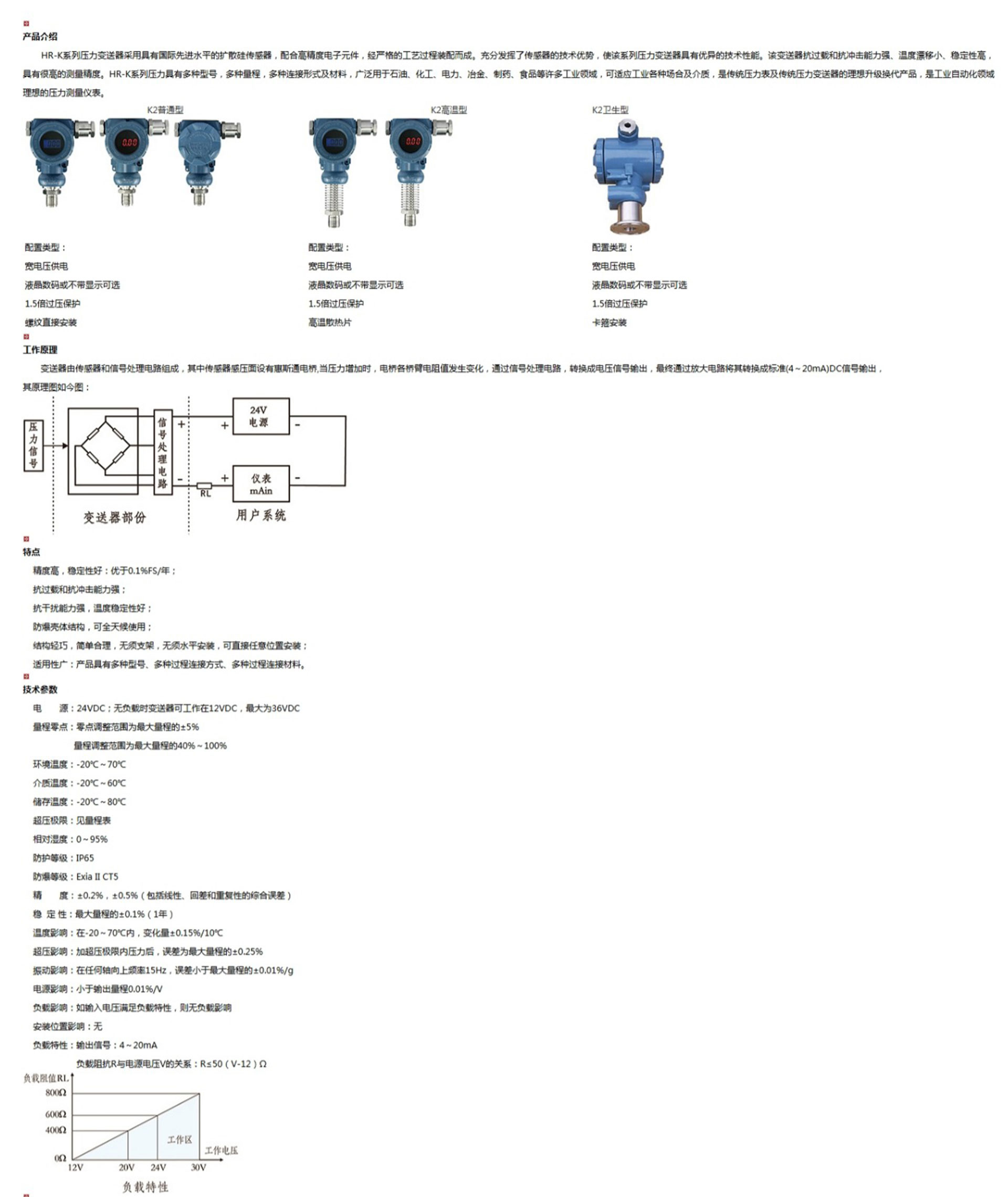 HR-K系列壓力變送器采用具有國(guó)際先進(jìn)水平的擴(kuò)散硅傳感器,配合高精度電子元件,經(jīng)嚴(yán)格的工藝過程裝配而成。充分發(fā)揮了傳感器的技術(shù)優(yōu)勢(shì),使該系列壓力變送器具有優(yōu)異的技術(shù)性能。該變送器抗過載和抗沖擊能力強(qiáng)、溫度漂移小、穩(wěn)定性高,具有很高的測(cè)量精度。