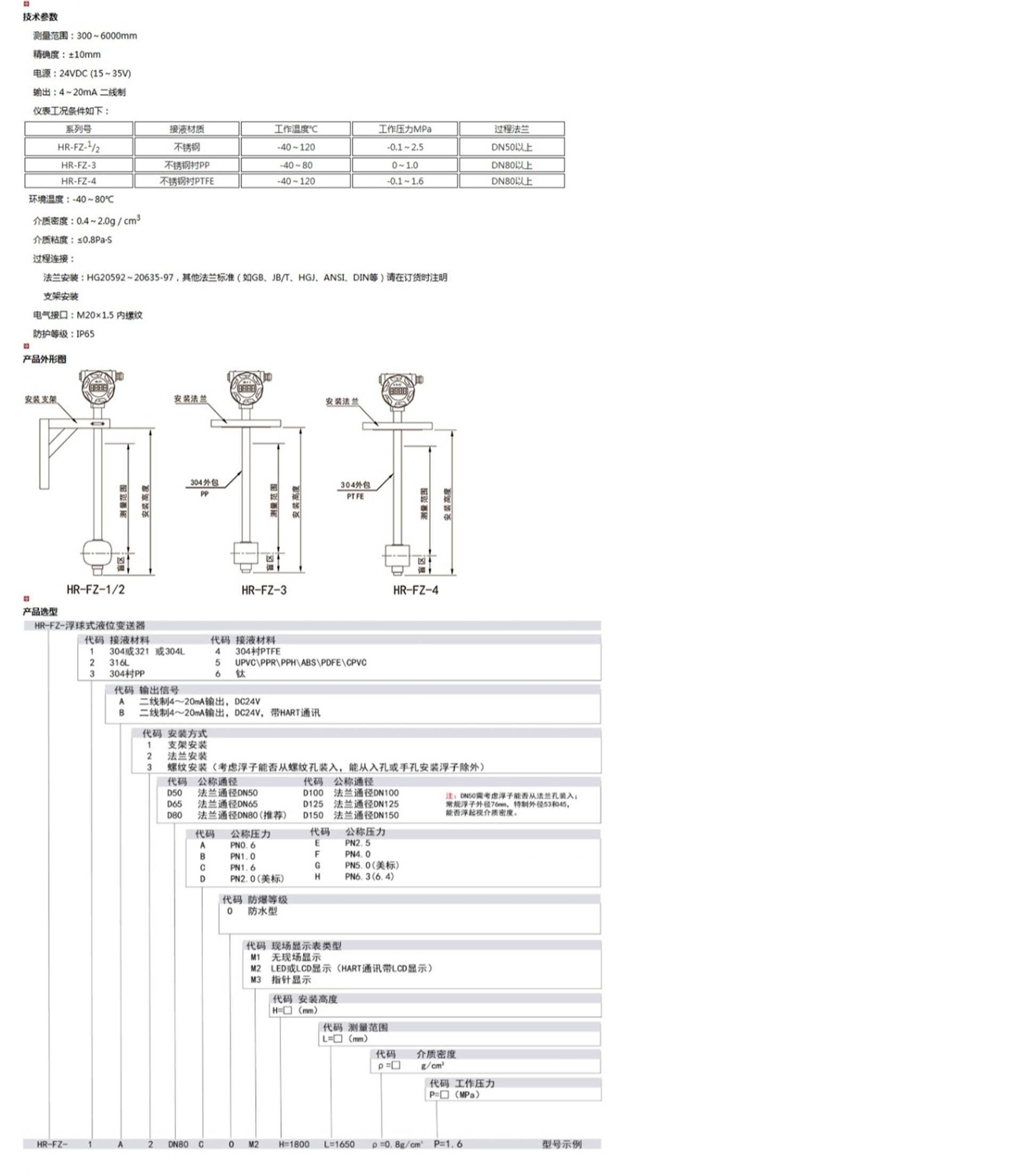 HR-FZ系列浮球式液位變送器,用于將容器內(nèi)的介質(zhì)液位變送為4~20mA二線制標準信號輸出。另外,變送器還可以提供現(xiàn)場指示。